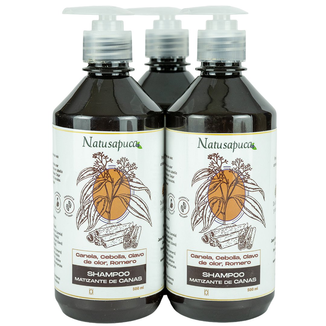 Devuélvele vitalidad, brillo y tono natural a tus canas con el Shampoo Matizante de Canas y Regenerador Capilar de Natusapuca. Elaborado con extractos orgánicos de plantas como canela, cebolla, clavo de olor y romero, este shampoo combina el poder de los matizantes naturales con un efecto regenerador profundo, ideal para fortalecer y revitalizar el cabello canoso.